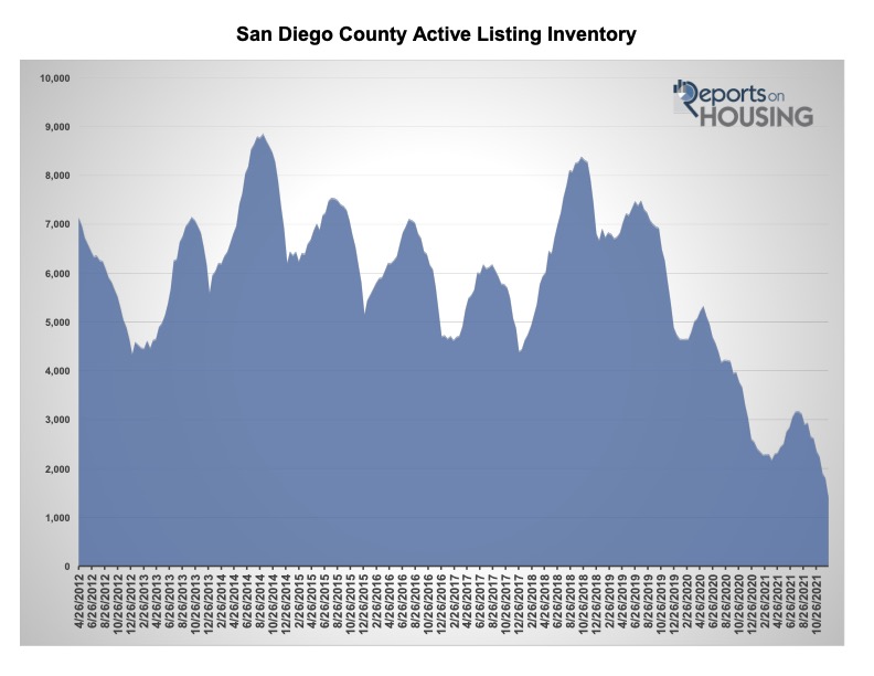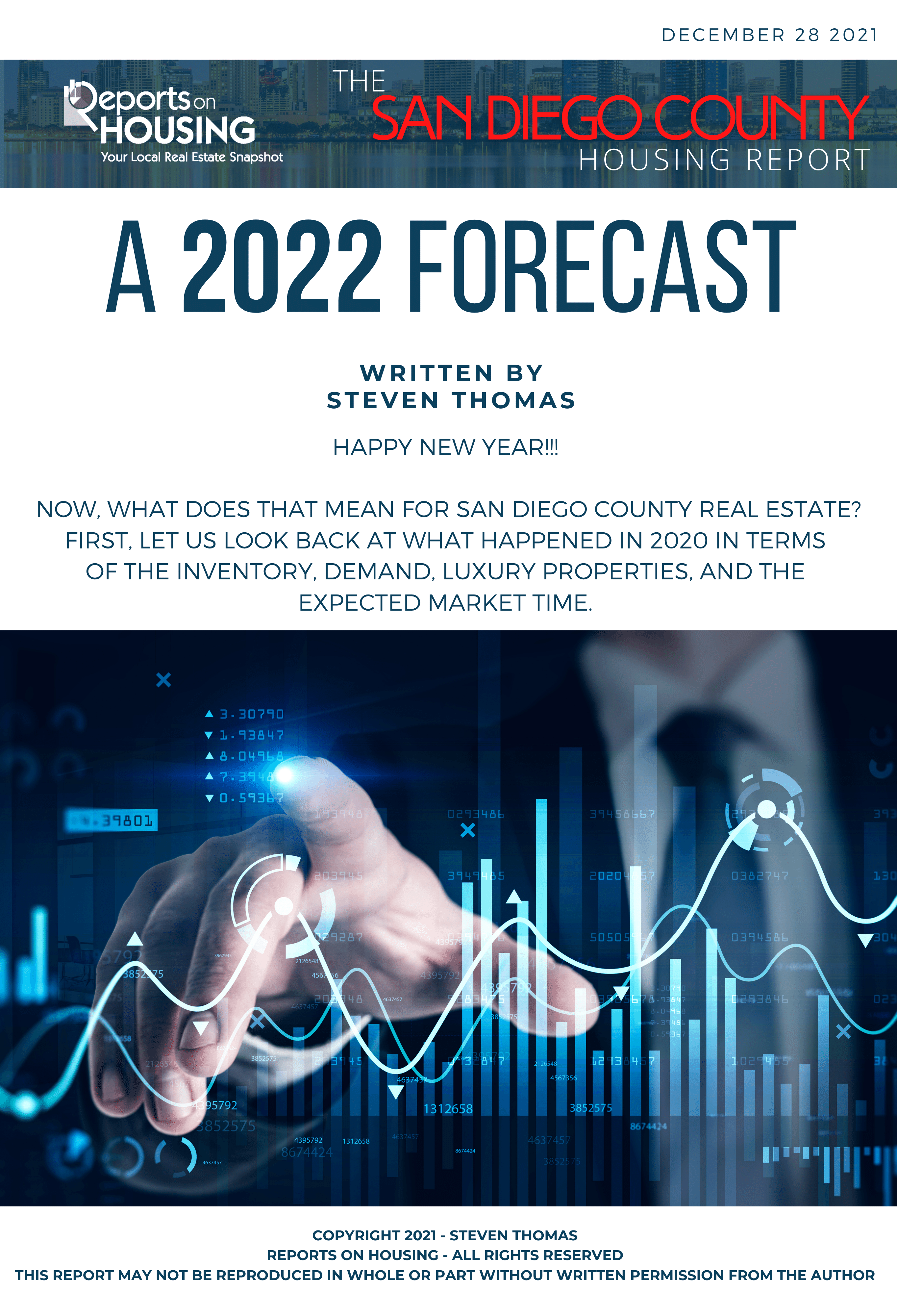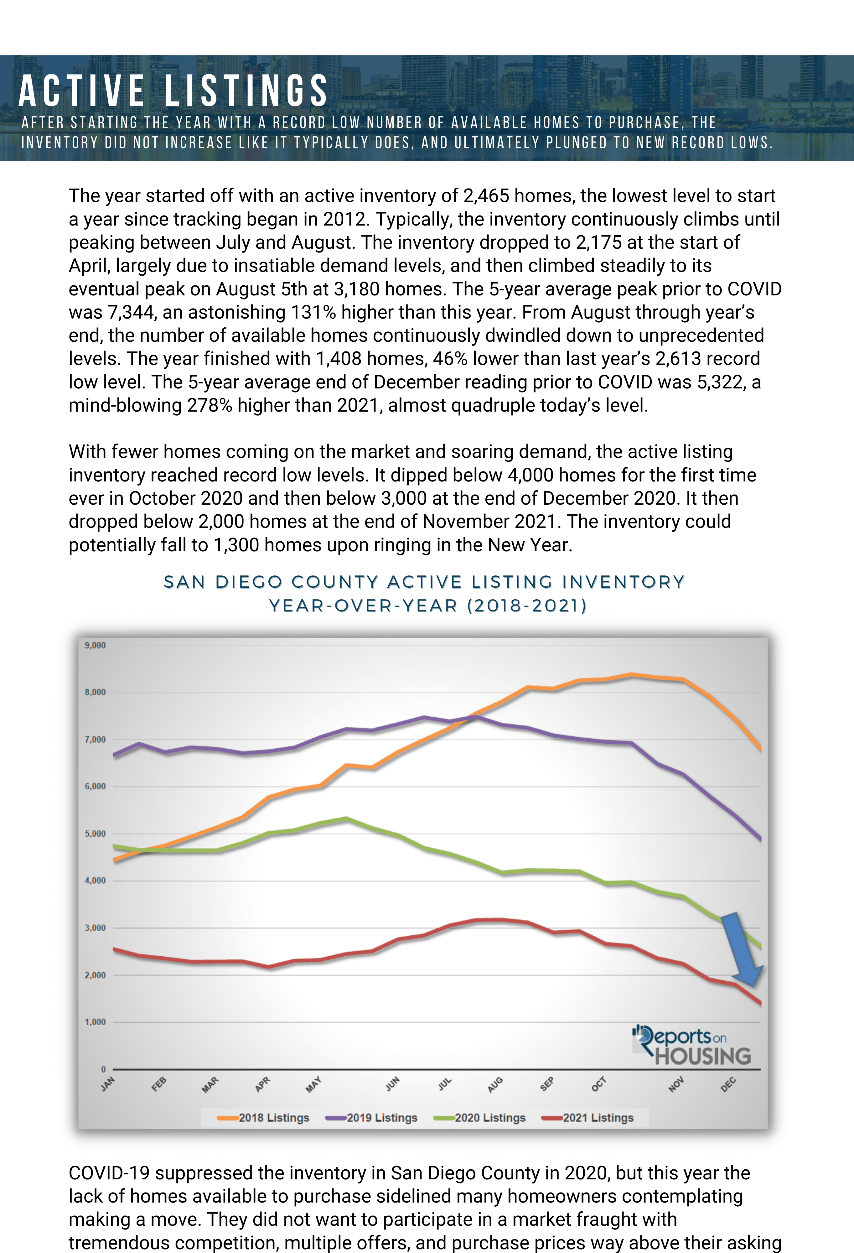- Active Inventory – the year will begin around 1,300 homes, the lowest start by far since tracking began in 2012. It will be 47% less than the 2,465 start to 2021, the prior record low. With very few available homes to purchase, housing will be extremely hot on January 1. The theme for 2022 will be the same as 2021, not enough homes for buyers to purchase. Instead, they will all be in escrow. Expect the active inventory to peak around August eclipsing 5,000 homes, well below the over 7,300 home peak prior to COVID.